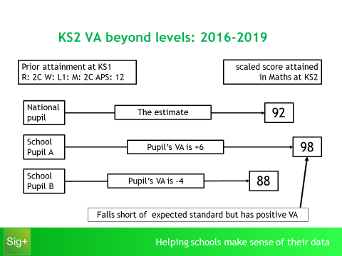 In this example, pupil A is +6 and pupil B is -4; the average VA for this (admittedly small) sample is therefore +1 ((6 + -4)/2). More importantly, it should be noted that Pupil A has exceeded the VA estimate, and has a positive VA score, despite not having met the expected standard. Conversely, it is possible for a pupil to meet or exceed the expected standard but still end up with a negative VA score if their scaled score is lower than the national average score of pupils with the same start point.